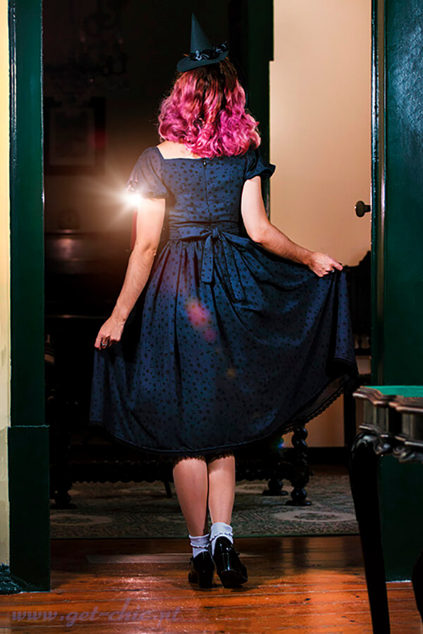 Menina vestida com vestido estilo princesa em tons de azul e negro fazendo lembrar o céu estrelado.